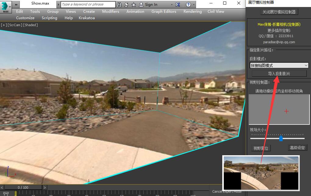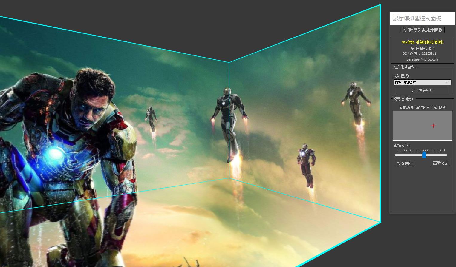 当我们输出了最终的投影画面,如果您并不在展厅现场,无法及时的看到投影效果,插件还专门为您准备了一个模拟现场测试的工具。 点击“辅助工具”-“模拟现场测试”,插件将启动一个模拟场景,该测试场景将为您提供所有插件内提供的投影输出形式的测试。 启动模拟场景后我们可以看到一个“视野控制器”面板,请不要关闭该面板,我们的测试将完全通过该面板进行操作方可得到跟现场一致的正确的投影效果。 |