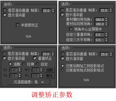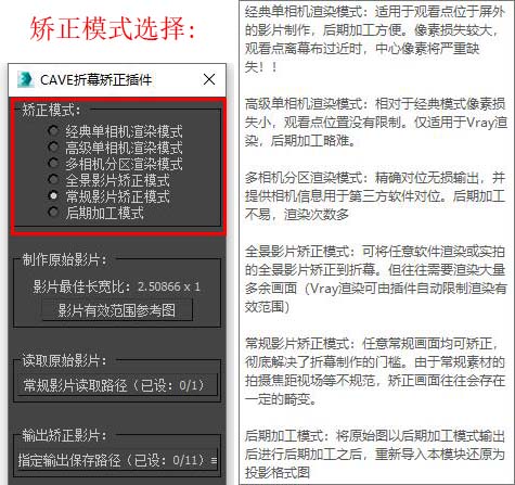 全景影片矫正模式:可将任意软件渲染或实拍的全景影片矫正到折幕。但容易渲染大量多余画面。