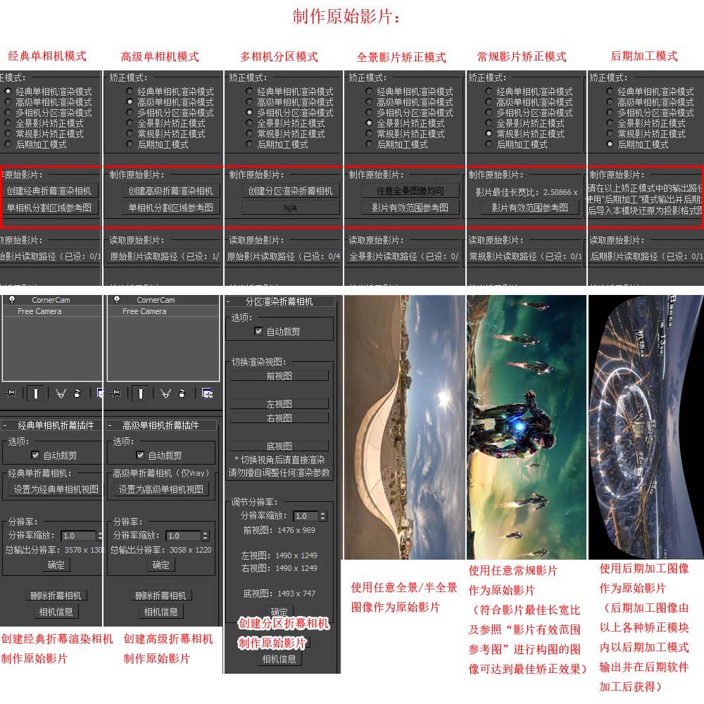 折幕插件定制版提供了三维渲染、素材矫正、后期处理三大模块。 其中三维渲染部分提供了经典单相机渲染、高级单相机渲染、多相机分区渲染三种模式。 素材矫正部分提供了全景(半全景)素材矫正、常规素材矫正两种模式。 最后提供了一种后期加工处理模式,三维渲染及素材矫正模式内均可提供后期加工图像输出,将任意形式的三维(素材)图片转换成单张全画幅可后期加工的图像,对该图像进行后期加工后即可在本模式内还原为所需要的投影形式。 |