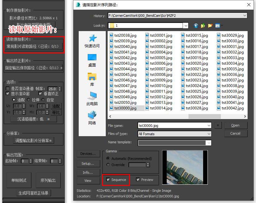 | 导入原始影片 我们需要将上一步中制作好的原始影片导入插件进行矫正方可得到可用于投影的图像形式。 点击读取原始影片路径导入原始影片,只要是max自身支持的格式均可以导入,但是不建议直接读取视频格式,因为视频解码太杂,很容易出现错误,建议转为图片序列后读取,如果需要读取序列,请务必勾选Sequence序列选项。 请尽量使用XXX00001.tga规范形式命名的序列,尽量避免使用中文路径,使用中文路径和一些特殊符号可能导致读取错误。同时请尽量避免使用纯数字命名的序列,纯数字命名可能导致插件错误地判断序列的起始结束帧。 |