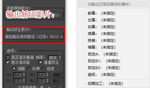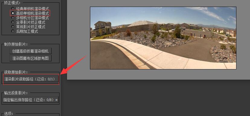 | 如果您的幕布为曲面幕布或者梯形幕布等其他异形幕布,我们需要回到矫正插件,将刚刚渲染的各个方向的渲染图分别导入矫正插件内的“读取原始影片”栏内。 | ![]() |