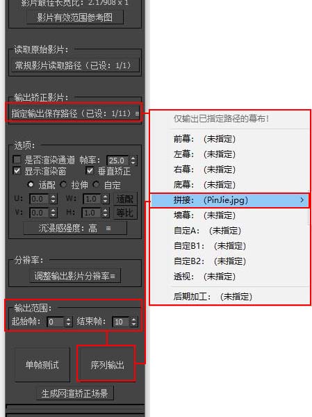| 如果您读取的是图像序列并且需要矫正成投影序列,你可以在输出范围内设定输出的帧数范围。 | ![]() |