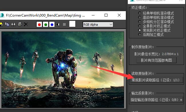 到这里我们已经得到了一张原始图像,但该图像并不能直接用于投影,我们需要在矫正插件内将它转换成可投影的图像形式。 回到矫正插件,仍旧选中“高级单相机渲染模式” 在“读取原始影片”栏内将刚刚渲染并后期加工好的原始图像在此处导入。 |
