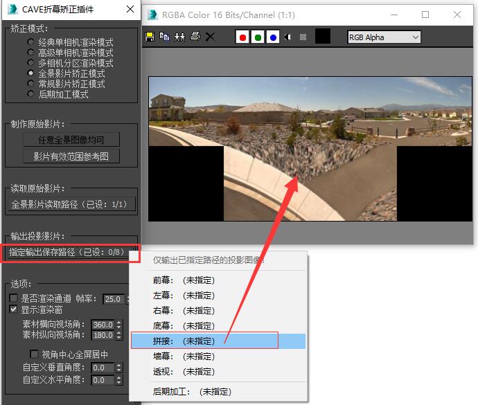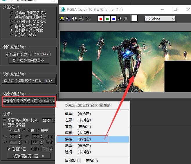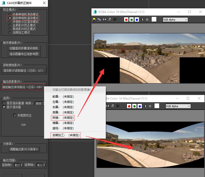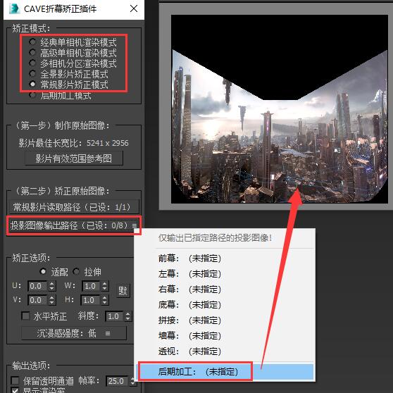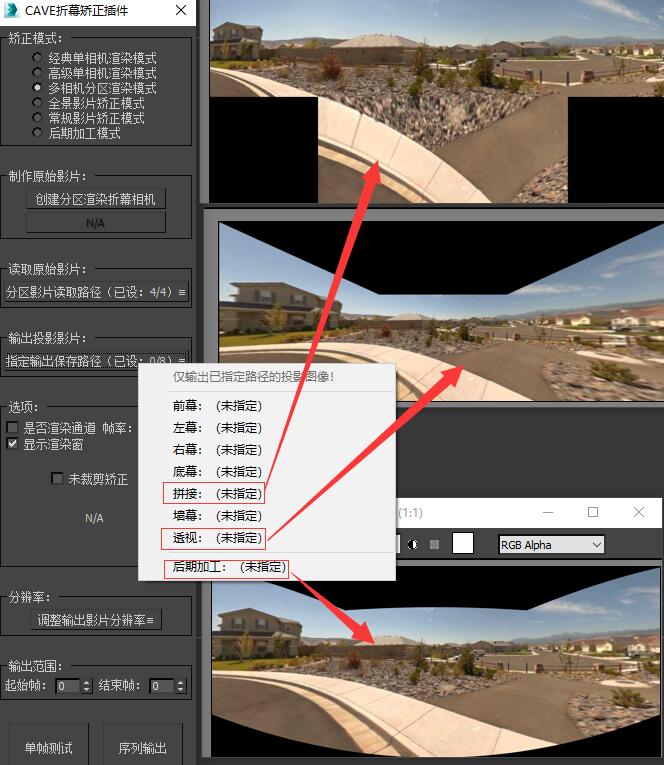 然后点击“输出投影影片”栏中的“指定输出保存路径”按钮,选择一种我们需要的投影图像形式,并指定好保存路径。 插件内提供了所有常见的投影图像输出格式,我们可以根据自己的硬件需求随意选择一种使用,如果插件内提供的投影格式仍旧不能满足您的投影需求,您也可以定制任意您需要的投影图像形式。 这里我们以常见的拼接输出形式为例,我们指定好拼接输出保存路径,点击序列输出,您就可以得到一张如图所示的拼接投影图。 这里给大家介绍一下“透视”输出格式,透视输出格式输出的画面与“经典单相机渲染模式”渲染的画面是相同的,他们都可以用于后期制作,画面没有畸变,但是画质损失较大,如果您需要一个精确的后期制作方案,你可以将您在任意模式中制作的原始渲染图矫正为“透视”画面进行后期制作,并在“后期加工模式”模块中还原为投影格式。注意,如果您的观看点离幕布过近,画质会受到严重损失,该“透视”模式将不能使用! 如果您需要对渲染图进行简单的后期加工,您可以在此处选择“后期加工”输出路径,插件将为您输出一张全画幅低畸变的后期加工图像供您进行后期制作,该模式会有轻微的畸变,但对画质的保留很好。 如果您选了后期加工输出,请在后期加工完成后回到矫正插件,并使用“后期加工模式”模块将加工后的图像重新矫正回投影格式,我们将在后面详细介绍后期加工模式的使用方法。 |