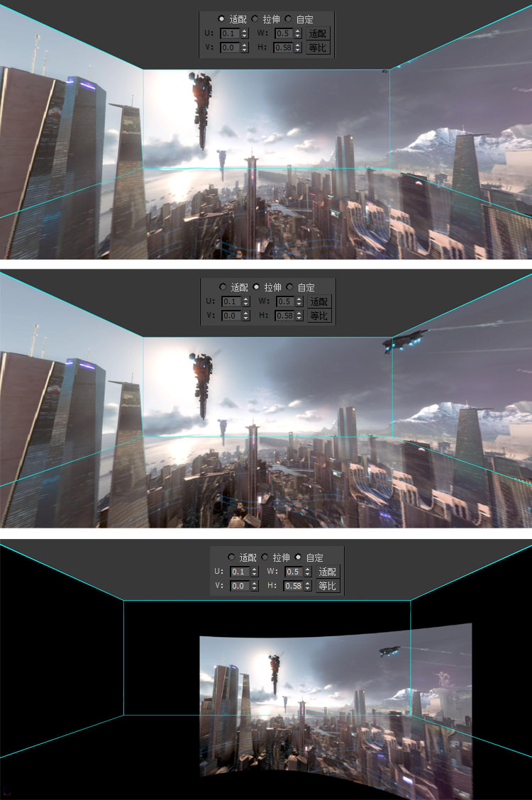 如果您的原始素材长宽比并不在最佳长宽比上,插件也提供了“适配”、“拉伸”、“自定”三种模式为你处理长宽比的匹配问题。 “适配”模式:插件将自动将您的图像裁剪至最佳长宽比上,以保证画面不会有拉伸变形。 “拉伸”模式:如果你并不介意画面的拉伸,而是需要得到更全的画面,那么您可以选择“拉伸”模式。 “自定”模式:如果上述两种模式都不能满足您的要求,那么您可以选择“自定”模式,使用本模式您可以自由地调整图像在幕布上显示的位置。 |
