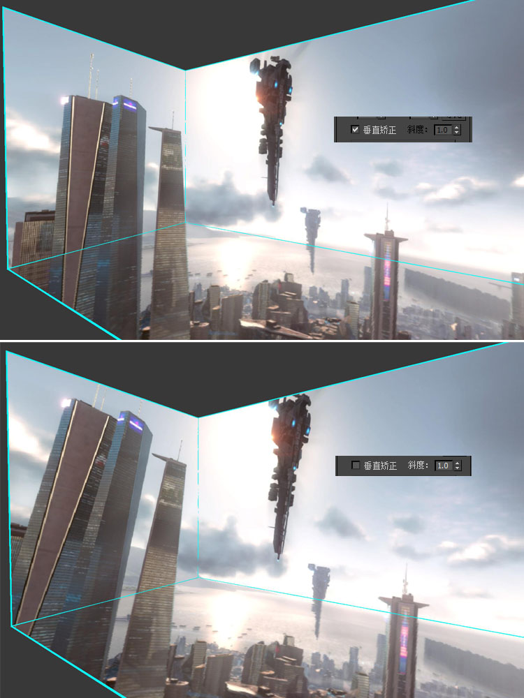 | “常规影片矫正模式”可以为您将任意的图像,如实拍素材、后期合成素材、常规镜头渲染的画面等任意素材矫正到折幕上,但要注意的是,由于普通图片的相机参数并不规范,强行矫正到折幕上可能会引起一定的畸变,这跟折幕相机或全景图的矫正画面的准确程度是无法相比的。但“常规影片矫正模式”可以使任意的图像在各块幕布之间是没有折痕的,是透视一致的,能够解决许多因为无法使用折幕相机制作(如实拍)或折幕相机制作的相对繁琐(如后期加工)而带来的困扰,他能够让您轻松地把折幕影片制作变得更加的傻瓜式! | ||