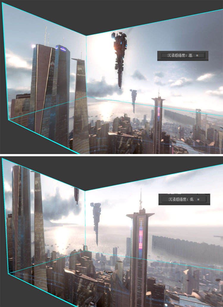 沉浸感强度是一个重要的参数,如果您对画面的矫正效果不满意,调节该参数能够使画面得到最大的改善! 沉浸感强度(高):如果您使用高沉浸感矫正的画面并没有太大的违和感,那么恭喜你,你可以直接使用高沉浸感参数来获得最大的沉浸个效果,通常高沉浸感适用于大广角实景类的画面。 沉浸感强度(中):如果使用高沉浸感让你感到画面有明显的畸变,你可以降低沉浸感,中沉浸感适用于大部分的普通素材。 沉浸感强度(低):如果您的画面是由大量文字、线条等比较规则的元素组成的合成类画面,那么中沉浸感可能也无法掩盖画面的畸变了,那么请使用低沉浸感,低沉浸感的画面会有比较强烈的压迫感,并且画质损失相对较大,如果您的观看点距离幕布比较近,请尽量避免适用低沉浸感。如果您的观看点在幕布内,使用低沉浸感时你的矫正画面将无法铺满全屏! |