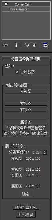 | 如果您需要删除折幕相机,请点击该按钮,插件会清空与插件相关的数据,如果手动删除修改器,场景中可能会残留部分插件辅助物,如果你已经这么做了,请手动清空“cornercam”层内的所有物体。 | ||