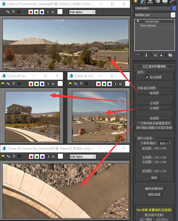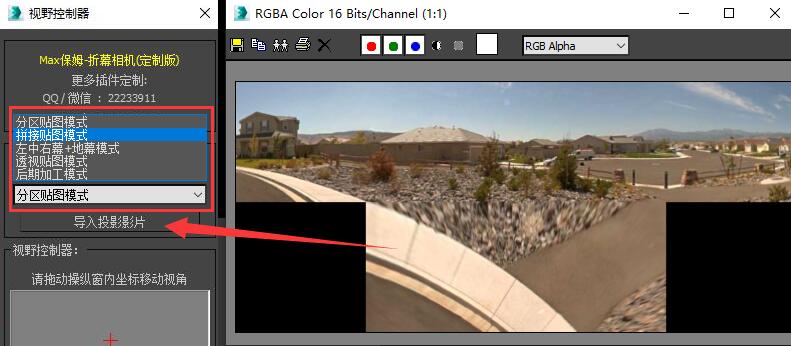 多相机分区渲染模式:精确对位无损输出,预览视图与渲染视图、投影图像完全匹配,能够精确地进行相机构图,并提供相机信息用于第三方软件对位。后期加工较难(可在插件内转换为全画幅低畸变可后期加工形式),渲染次数多。