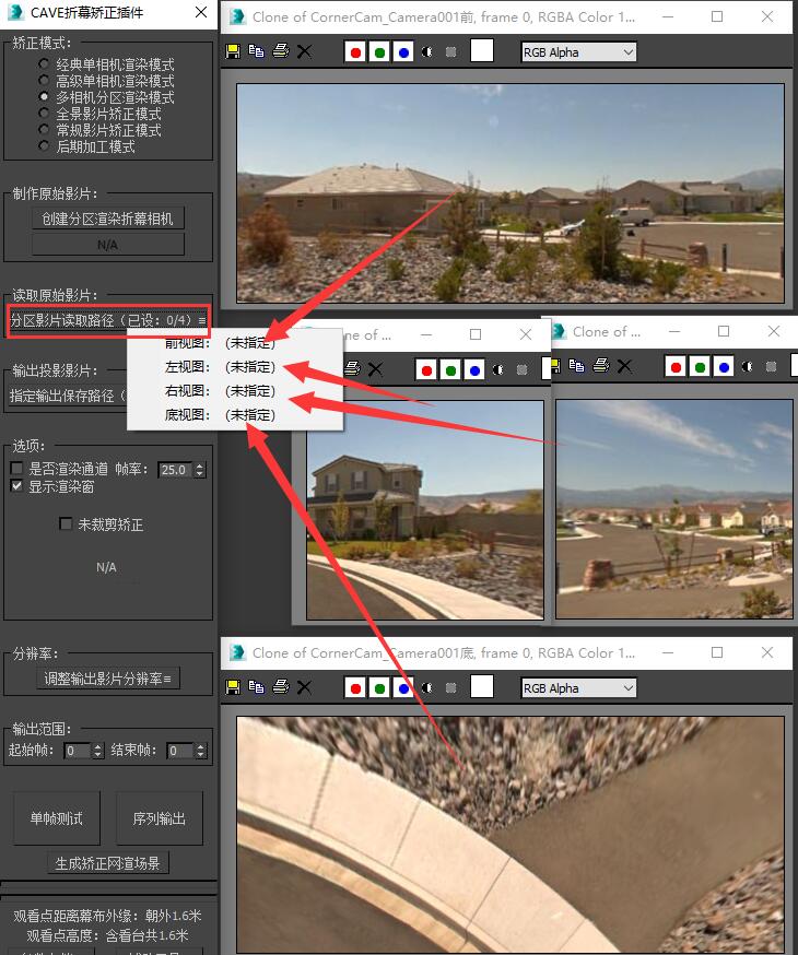| 启动插件,在矫正模式内选择“多相机分区渲染模式”。 | ![]() |