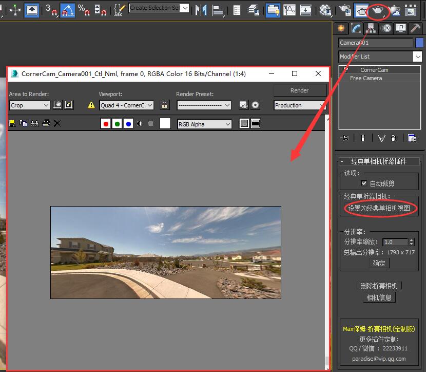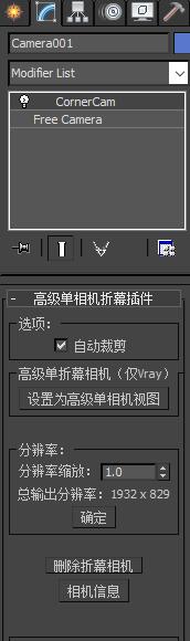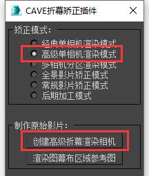 启动插件,在矫正模式内选择“高级单相机渲染模式”。 选择您所使用的相机,点击“创建高级折幕相机”按钮。 |