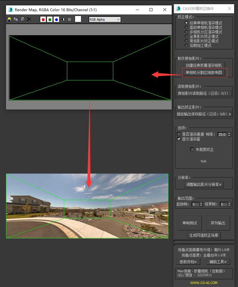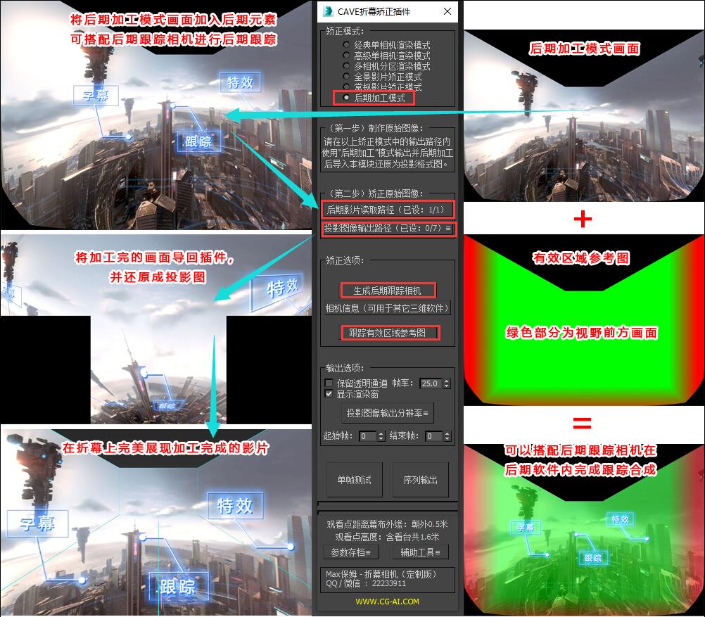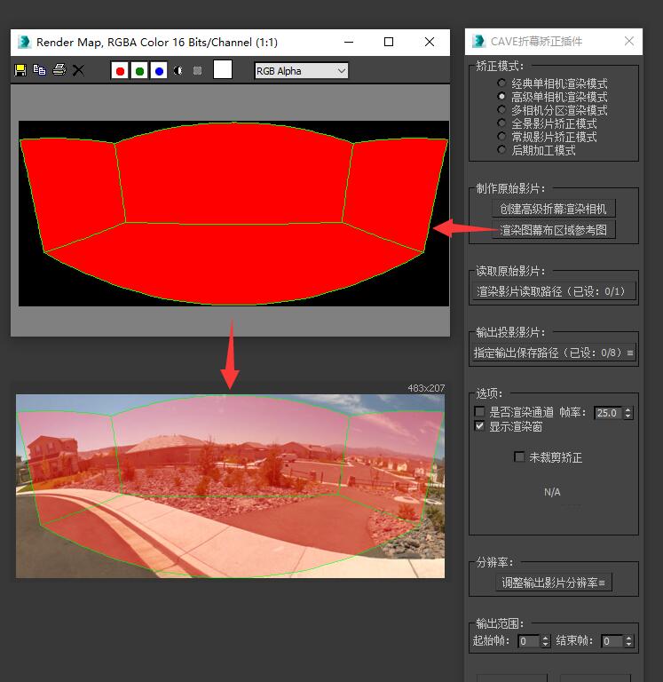 切换至“后期加工模式”,我们可以看到在“矫正选项”内提供了“生成后期跟踪相机”、“相机信息”、“跟踪有效区域参考图”三个内容。 “后期跟踪相机”可以将待处理的场景相机转换成一个可以进入后期并搭配“后期跟踪画面”进行后期处理的相机,如果您使用的是3dsmax,选中场景中的原相机并点击“生成后期跟踪相机”即可生成。如果您使用的是其他三维软件,可以通过相机信息手动制作一个后期跟踪相机,同样可以完美匹配后期跟踪画面。 “跟踪有效区域参考图”为一张带有红色与绿色颜色通道的参考图,该图尺寸及范围与上一步中输出的“后期加工模式图像”完全一致,可以在后期软件内互相叠加后进行区域参考。“跟踪有效区域参考图”绿色部分为视野前方的画面,可以搭配“后期跟踪相机”在后期软件内完美进行跟踪,红色部分为视野后方的画面,跟踪将逐渐偏离,只能进行校色的简单的后期加工,请尽量避免需要跟踪的后期元素进入到红色区域。 通过上述辅助工具在后期软件内进行后期加工后,即可将加工完成的影片导入插件,并输出还原成投影图像!~ |