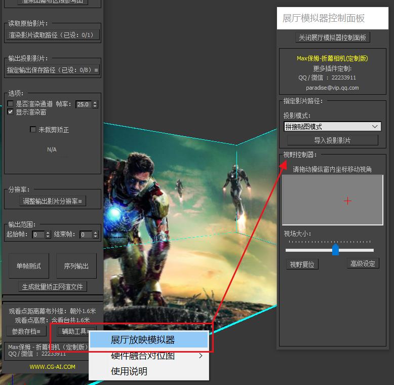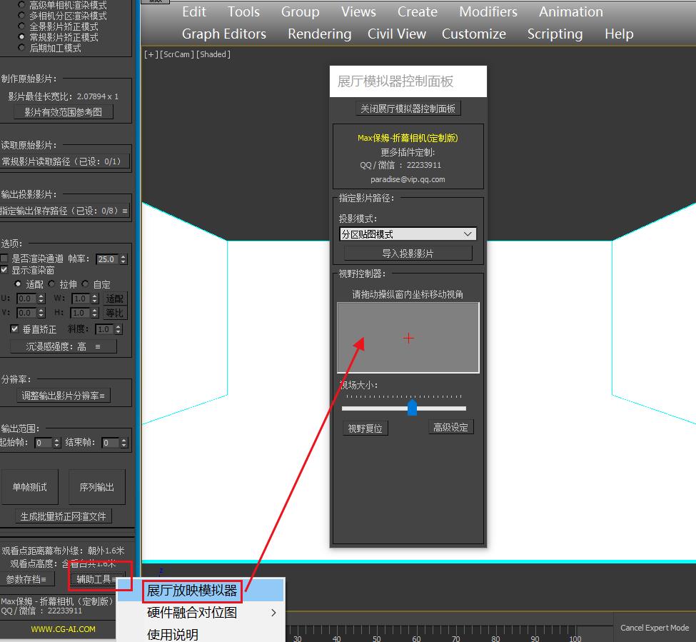 Max保姆折幕矫正插件是基于3dsmax平台编写的脚本插件,使用本插件需要依赖3dsmax平台运行,但我们并不需要懂得任何3dsmax操作知识,矫正插件已经将所有需要的功能集成到了插件面板内。只需要启动3dsmax,将插件拖入3dsmax软件即可启动插件,剩下的就没有3dsmax什么事了。插件内提供的折幕相机可以直接提交网渲,无需安装插件。同时插件内提供了矫正相机信息,在其他任何三维软件内我们同样可以使用插件内提供的相机信息手动搭好相机渲染后导入本插件内矫正为投影成品,插件内还提供了全景素材甚至常规素材的矫正形式。所以,您使用任何软件进行影片制作都可以放心搭配本插件完成您的折幕制作。 定制版没有电脑使用台数限制,没有使用时间限制,但定制版将依据当前项目所用的幕布尺寸规格进行定制,并不是通用插件,我们将会免费提供任何合理的修改需求直至项目结束,但您将无法在其他项目中继续使用以往的定制版本! 由于插件版本的不断更新,本教程所示的部分功能可能与最新版本插件有所差别,如有任何问题,请随时联系我们,我们会为您提供更专业的解答。 |