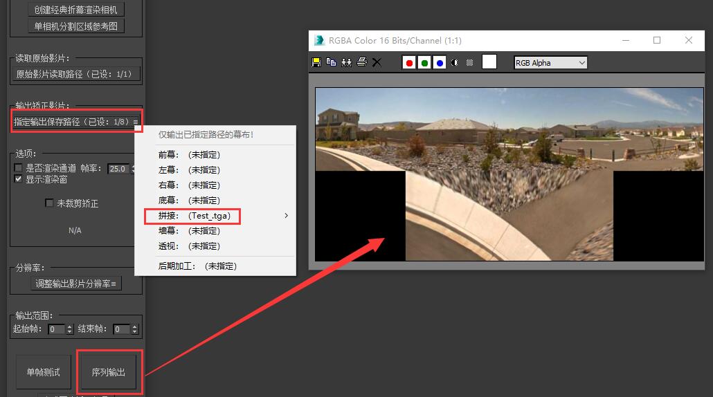 然后点击“输出投影影片”栏中的“指定输出保存路径”按钮,选择一种我们需要的投影图像形式,并指定好保存路径。 插件内提供了所有常见的投影图像输出格式,我们可以根据自己的硬件需求随意选择一种使用,如果插件内提供的投影格式仍旧不能满足您的投影需求,您也可以定制任意您需要的投影图像形式。 这里我们以常见的拼接输出形式为例,我们指定好拼接输出保存路径,点击序列输出,您就可以得到一张如图所示的拼接投影图。 如果您需要对渲染图进行后期加工,您可以在此处选择“后期加工”输出路径,插件将为您输出一张全画幅低畸变的后期加工图像供您进行后期制作。 如果您选了后期加工输出,请在后期加工完成后回到矫正插件,并使用“后期加工模式”模块将加工后的图像重新矫正回投影格式,我们将在后面详细介绍后期加工模式的使用方法。 |