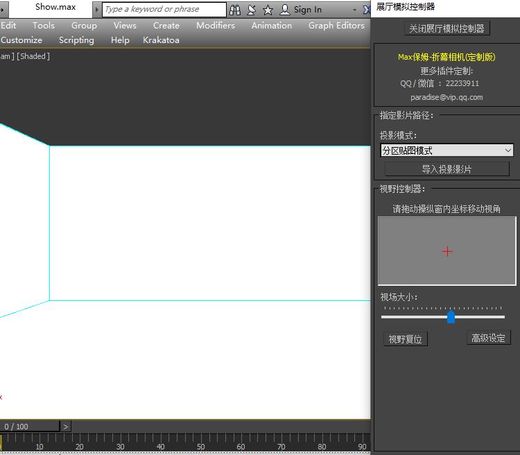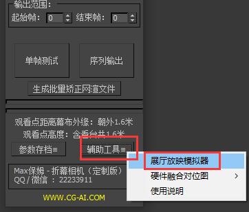 展厅放映模拟器 插件内提供了模拟展厅模拟效果的Max场景,该场景为现场1比1的展厅幕布模型,启动场景的同时将会启动一个展厅模拟器控制面板,该模拟器能让你模拟所有的投影方案,还有灵活的视野控制操作窗,可以让你以最贴近现实的感受去体验现场的投影效果,展厅模拟器的具体操作将在后面详细介绍。
